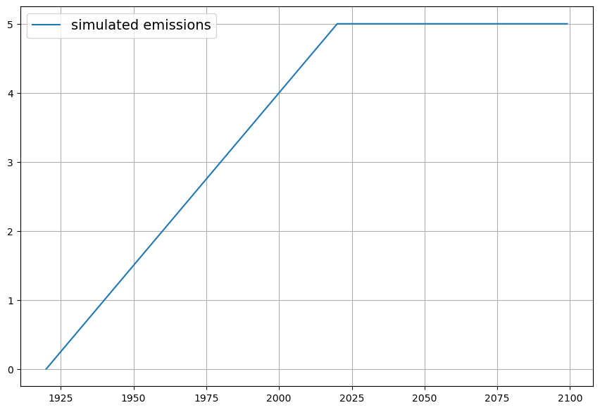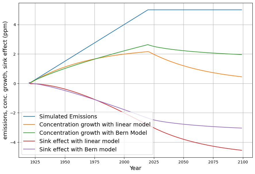 Wie oben beschrieben, ist die gemessene Senkenwirkung die Schnittstelle zwischen Modell und Wirklichkeit. Vor der Anwendung auf die tatsächlichen Messdaten wird die geplante Vorgehensweise mit einem künstlichen einfachen Emissionsverlauf simuliert, der qualitativ dem tatsächlichen Verlauf ähnlich ist. Der Vorteil eines wohldefinierten Emissionsverlaufs ist, dass die Modellunterschiede klar herausgearbeitet werden können, ohne von Rauscheffekten und anderen unbekannten Einflüssen beeinflusst zu sein. Außerdem wird nicht zwischen gemessenen Emissionen der Vergangenheit und projizierten Emissionen der Zukunft unterschieden. Die simulierten Emissionen wachsen ab 1920 für 100 Jahre linear auf 5 ppm/Jahr an und bleiben von da an konstant (Abb 7):