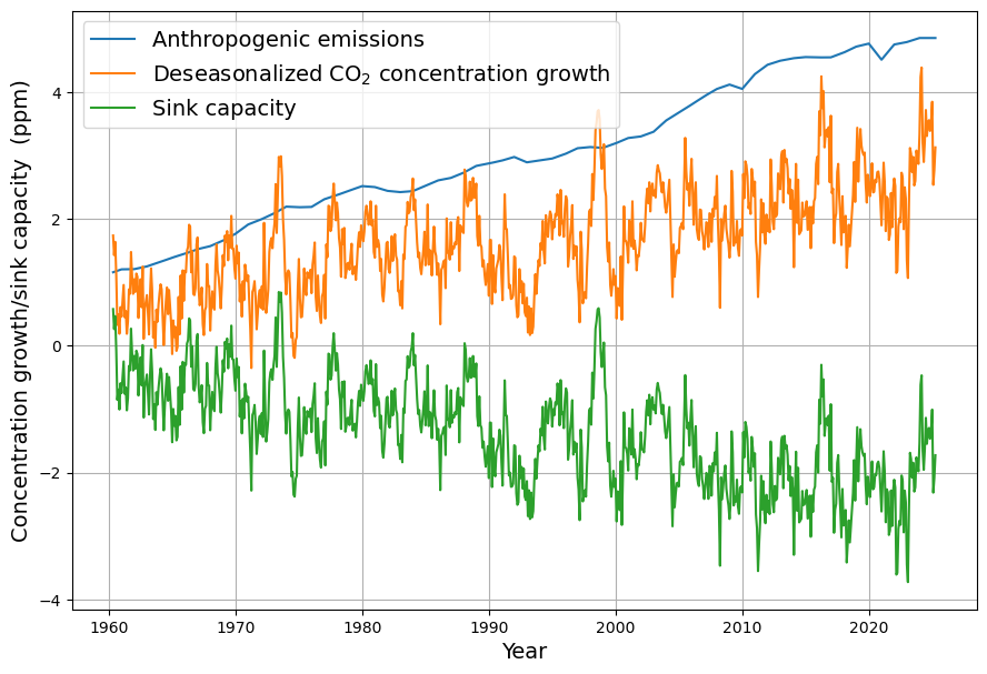 Diese Senkenwirkung ist aus den verfügbaren Emissions- und CO2-Konzentrations-Daten ohne Modellierung leicht ermittelbar und in Abbildung 1 als Zeitserie ab 1960 gezeigt. Die Daten des monatlich gemessenen Konzentrationszuwachses sind desaisonalisiert, indem jeweils die Differenz zum gleichen Vorjahresmonat bestimmt wird. Emissionen und Konzentration sind in der gleichen Maßeinheit ppm gemessen (1 ppm = 2,123 Gt C = 7,8 Gt CO2)