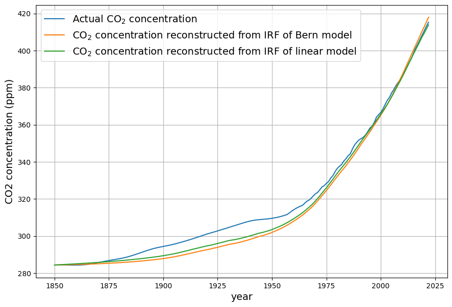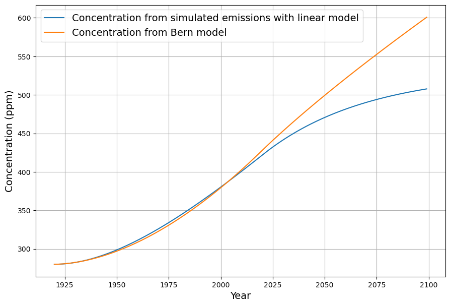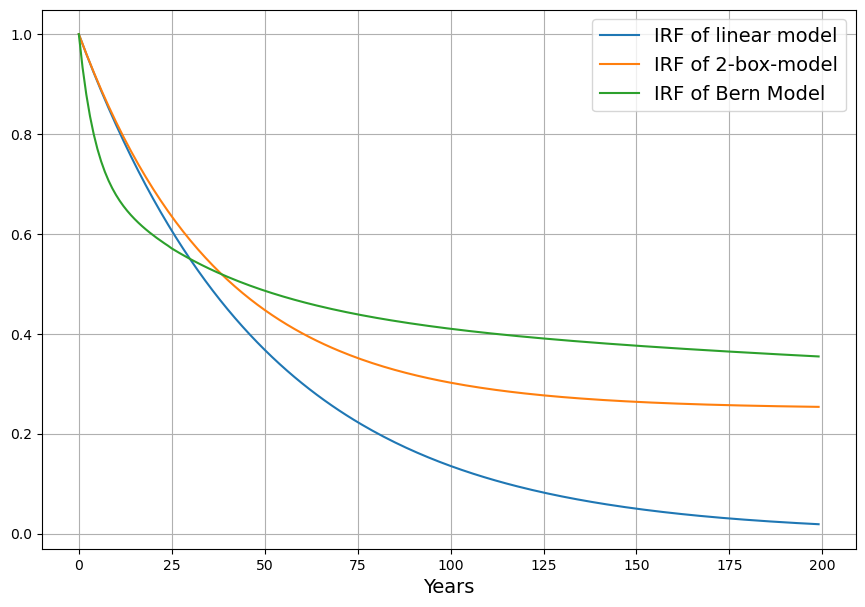 Während zu Beginn der Konzentrationsabfall des Berner Modells stärker ist als beim linearen Modell, wird der Verlauf bald flacher, sodass nach 100 Jahren nur 60% absorbiert sind, beim linearen Modell sind es da bereits 85%. Das 2-Boxen-Modell liegt vom Verlauf her zwischen dem linearen und dem Berner Modell, langfristig geht es ähnlich wie das Berner Modell in die Sättigung, d.h. es bleibt ein substantieller Teil des CO₂ in der Atmosphäre.
