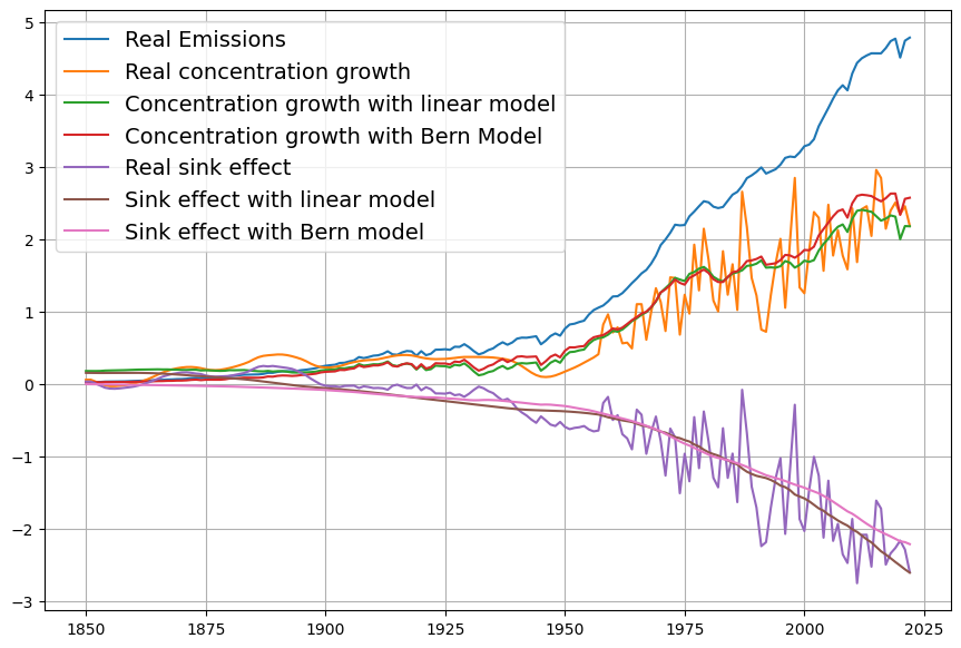 Es ist aus Abb. 8 deutlich erkennbar, dass die Senkenwirkung des Berner Modells im Vergleich zum linearen Modell auf lange Sicht deutlich nachläßt. Durch Differenzbildung jeweils benachbarter Datenpunkte wird das Konzentrationswachstum bestimmt (Gleichung (1)). Die für das Unterscheidungskriterium wichtige gemessene Senkenwirkung wird dann aus der Differenz zwischen Emissionen und Konzentrationswachstum nach Gleichung (2) bestimmt. Alle Daten sind in Abbildung 8 zusammengefasst.