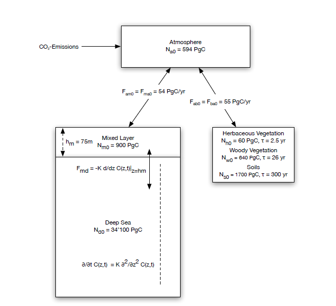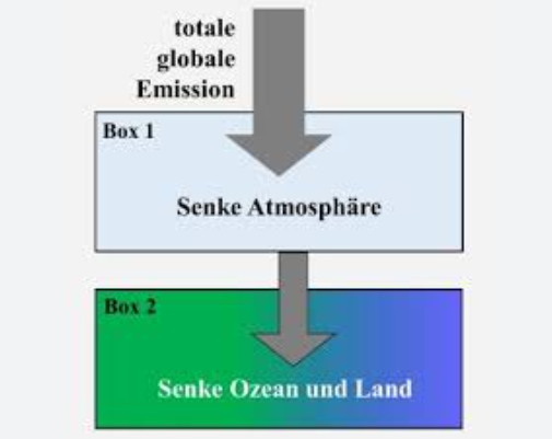 Um nicht voreilig falsche Schlussfolgerungen aus dem Berner Modell zu ziehen, erscheint es wichtig, zunächst einen Vorläufer des Berner Modells zu betrachten, das sogenannte 2-Boxen-Modell. Ausgangspunkt des 2-Boxen-Modells ist die im Prinzip richtige Überlegung, dass auch die CO₂-Senken, die Ozeane und die Landpflanzen, endlich sind und nur eine begrenzte Menge an CO₂ aufnehmen können. Das einfachste Modell, das diesen Umstand berücksichtigt, ist das 2-Boxen-Modell, wonach die Atmosphäre die eine Box darstellt, die Ozeane zusammen mit den Landpflanzen die 2. Box.