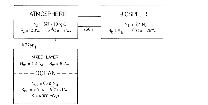 Um nicht voreilig falsche Schlussfolgerungen aus dem Berner Modell zu ziehen, erscheint es wichtig, zunächst einen Vorläufer des Berner Modells zu betrachten, das sogenannte 2-Boxen-Modell. Ausgangspunkt des 2-Boxen-Modells ist die im Prinzip richtige Überlegung, dass auch die CO₂-Senken, die Ozeane und die Landpflanzen, endlich sind und nur eine begrenzte Menge an CO₂ aufnehmen können. Das einfachste Modell, das diesen Umstand berücksichtigt, ist das 2-Boxen-Modell gemäß Abb. 5, wonach die Atmosphäre die eine Box darstellt, die Ozeane zusammen mit den Landpflanzen die 2. Box.